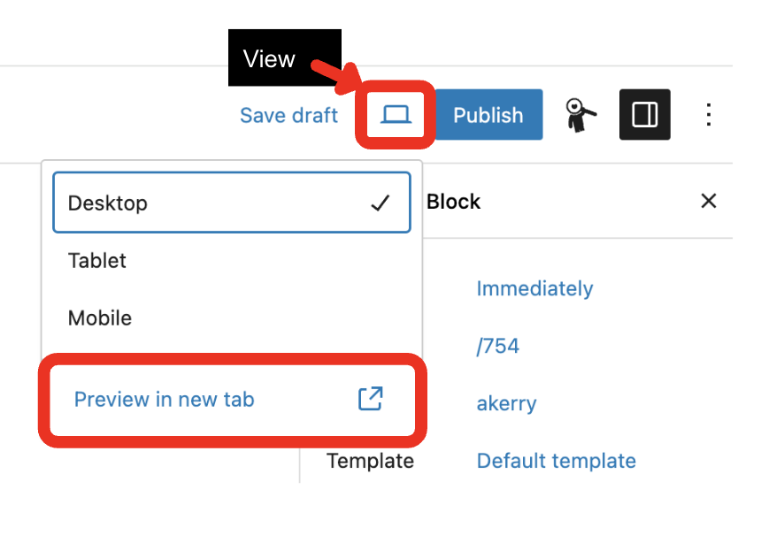 Preview your draft page at any time while you’re building it by selecting the ‘View’ icon in the top right menu and choosing ‘Preview in new tab’.