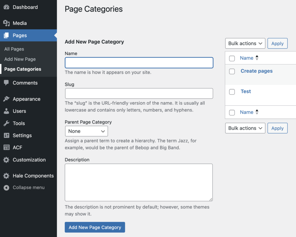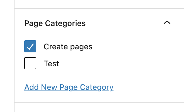 In the edit page view, in the right-hand panel, you’ll see an option for ‘Page Categories’.