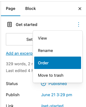 In the right-hand page settings panel when you’re in edit view, click the 3 dots at the top and select ‘Order’.