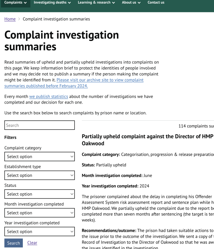 Complaint investigation summaries on the Prisons and Probation Ombudsman site: