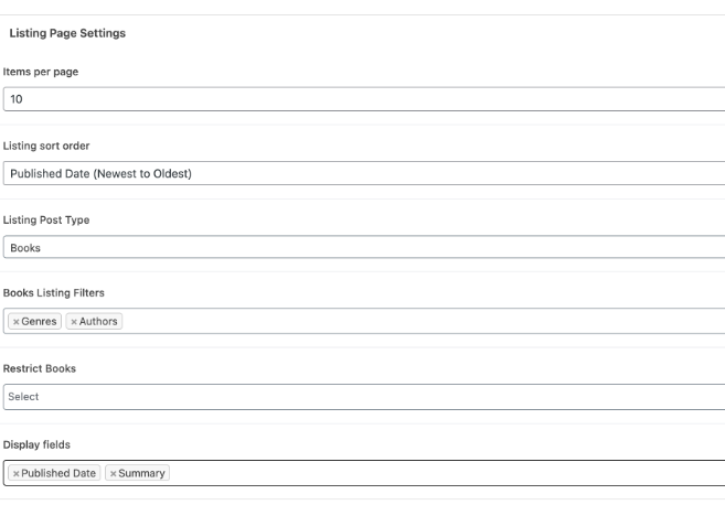 You can restrict a listings page to show just one subset of the post type. If you wanted a listings page for just one particular genre of books, you’d choose ‘Genre’ under ‘Restrict Books’. A second box then appears for you to choose the genre you want to restrict it to.