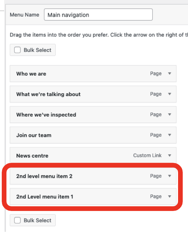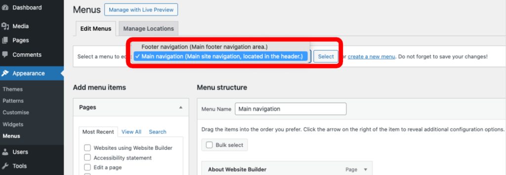 Make sure that the ‘Main navigation’ is selected. If it’s not, click on the ‘Select a menu to edit’ drop down, pick ‘Main navigation’ from the list and click ‘Select’.