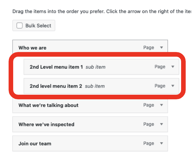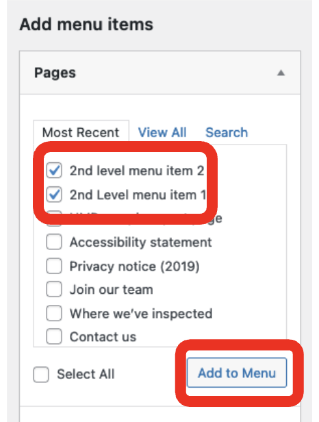 You’ll see 2 sections: ‘Add menu items’ and ‘Menu structure’. This is where you select pages to add to your menu and then arrange them in the order you need.