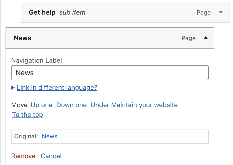 You can rename the navigation item by changing the ‘Navigation Label’, or delete the item by clicking ‘Remove’.