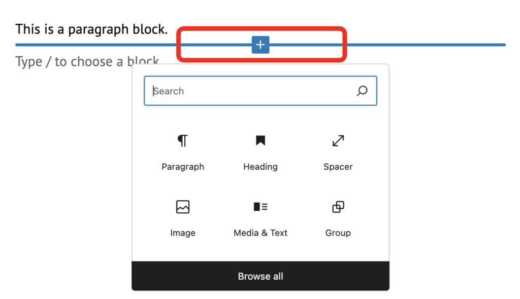 When you click the ‘+’ icon or choose ‘Browse all’ blocks, you’ll see a full list of the different blocks available.