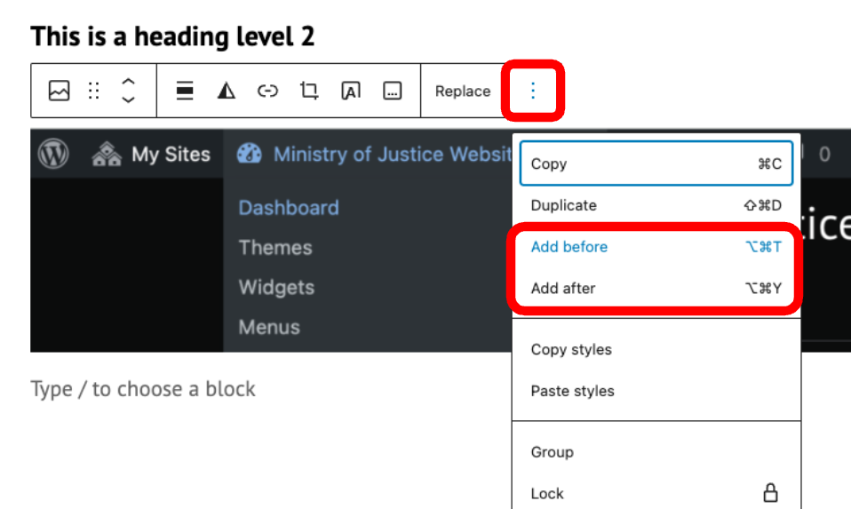 Finally, when you’ve added some blocks on your page, you also have the option of using a block’s toolbar and choosing to ‘Insert before’ or ‘Insert after’.
