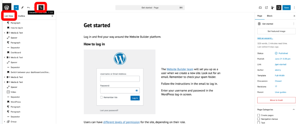 To do this, go into your editor view on the page. To open list view, select the ‘Document Overview’ icon as shown below. This will then open the list view of all blocks on the page, including ‘nested’ blocks (blocks within blocks).